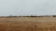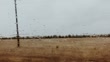 Car driving on a wet highway in rainy weather conditions. View from car window on raindrops on a glass window blur the view of a flat, dry field and distant trees under a gray sky. - HD stock video