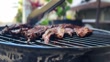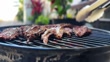 Grilling stakes. Barbecuing in the backyard. BBQ in Hawaii. Red coals. Red charcoals.