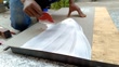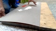 Carpenter applying adhesive on laminated plastic sheet and working at construction site.