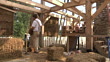 WS PAN Carpenter places bale of straw during framing of an energy efficient post / Grass Lake, Michigan, USA - HD stock video
