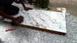 Carpenter rubbing dry cloth on laminated plastic sheet after pasting on wood.