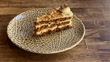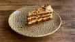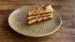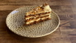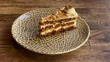 High angle close-up shot of a slice of carrot cake over a plate at sidewalk cafe