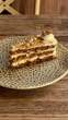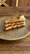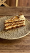 High angle close-up shot of a slice of carrot cake over a plate at sidewalk cafe