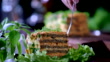 Eating a slice of homemade sandwich cake with rye bread and carrot