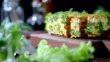 Taking a slice of homemade sandwich cake with rye bread and carrot