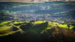 Aerial shot of Castell Dinas Bran, or Crow Castle , in Wales. The ruins are the remains of a castle that once stood on top of the hillside near the city of Llangollen, Wales, UK.