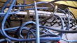 Cat5 Ethernet Cables Plugged into a Blinking Network Switch with Tangled Messy High Speed Internet Gigabit Cat6 Data Cables in the Background in an IT Networking Closet
