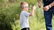 A 4-year old looks at the bluegill fish he just caught. His grandpa holds the fish out and he pokes it a few times and then gives it a kiss for good luck