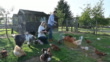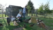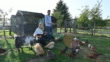 Wide angle view with lens flare of couple in casual clothing scattering feed for free range grazing bantam and brahma chickens and goats in afternoon sunshine.
