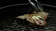A Caucasian Hand Places Grilled Shrimp from a Barbecue into a Metal Serving Container
