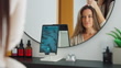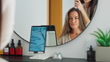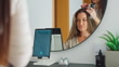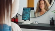 Medium shot of an adult Caucasian woman seated as a specialist gently scans her scalp, while she observes the process in the mirror, creating a calm and focused atmosphere in the spa setting.
