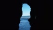 Drone flying through a cave on a beach.