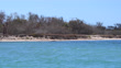 A fishermen boat arrives to the sandy beach in the deserted key. Vegetation is dry because of the drought.