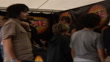 V Festival: Celebrities; Razorlight fan wearing Razorlight t-shirt waiting at edge of NME tent as music heard SOT, Razorlight singer Johnny Borrell along followed by other Razorlight members Carl Dalemo and Andy Burrows, sitting down at table for signing event / Razorlight fans along to table, chatting to members, getting autographs