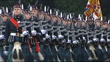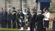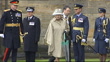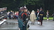 Ceremony of The Keys at Palace of Holyroodhouse; SCOTLAND: Edinburgh: Palace of Holyroodhouse:EXT / RAININGGVs of troops, in dress uniform, marching and lining up on parade ground / CU colour being held / troops straightening up / officer in busby / Queen Elizabeth II (wearing stone coloured raincoat, blue hat) and Prince Philip (Duke of Edinburgh) greeted by Lord Provost / Queen meeting dignitaries / Queen waiting as National anthem played / Queen reviews troops / Mayor hands keys to Queen / Duke looking at keys / Queen talking Queen's car arriving at Scottish Portrait Gallery / UPSOT cheers / Queen and Duke inside / Queen (now in very pale blue coat and hat) and Duke out of car, greeted and into building / GVs of Royal supporters with Union Jack / Queen and Duke leaving building and into car