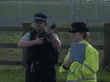 Channel Tunnel - security; ENGLAND: Kent:MS Policeman in flak jacket holds rifle and policewoman in fluorescent jacket standINT CAR/ near Folkestone:MS TRACK FORWARD along road as directed by police into road check areaEXTBV Police stand as car towards at checkpoint ZOOM ING/A Police helicopter hoveringINT HELICOPTERTLS Rail lines at approach to tunnel seen through windowINTCMS Det Supt Cliff Grieve (Kent Police) intvw SOT - We have been working closely with French police and Eurotunnel to design out the opportunities for terrorismBV Car up to frontier boothCBV Car waved through as green light in b/gEXTCMS Badge on French official's arm REFOCUS to another official behind as car through French frontierLA Official as cars past him to BVMS Under-car inspection pit TILT DOWN red and white striped barrierMS Fire engine towards into boxed areaBV Fire engine away onto freight shuttleINT TUNNELBV TRACK FORWARD behind fireman in fluorescent jacket and helmet as along in tunnelTMS Firemen wearing black coats with fluorescent stripes and helmets attend to compatriot on stretcherEXTMS SIDE Alastair Morton R-L as onto trainINT TRAIN2 SHOT Hall and Alastair MortonCMS Alastair Morton (Chairman, Eurotunnel) intvw SOT - It's a great deal less frightening than other forms of transportINT TRAINLMS TRACK FORWARD as along track and controls in front of train seen in f/g