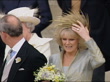 Charles and Camilla's wedding; ENGLAND: Windsor: St George's Chapel: EXTLMS Prince Charles, Prince of Wales towards from chapel doorway with new wife Camilla, Duchess of Cornwall (Wearing a floor-sweeping Guinevere-style coat and dress in porcelain-blue and gold and Philip Treacy head-dress) CMS Prince Charles & Camilla posing on stepsLMS Charles and Camilla as Queen Elizabeth II (wearing white coat and hat) along with Prince Philip, Duke of Edinburgh, followed by Prince William and Prince HarryCMS Camille next Prince Charles as Queen standing behind on steps PAN GV Royal family posing on steps after wedding ceremonyCMS Prince Charles next Camilla