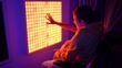 Young man in a wheelchair and female caregiver smiling joyfully while interacting with a vibrant sensory light wall.