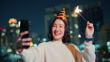Cheerful woman filming the sparkler in her hand, capturing its bright glow against the stunning city skyline as she counts down to the New Year. Excitement fills the air as she smiles, savoring the magical moment and the anticipation of a fresh start