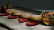 Cheesecakes with strawberries and honey sprinkled with powdered sugar on a dark slate board. Close-up shot.. - 4K stock video