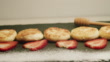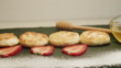 Cheesecakes with strawberries and honey sprinkled with powdered sugar on a dark slate board. Close-up shot. - 4K stock video