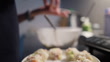 Close-up of a chef preparing delicious salmon and cucumber sushi balls on a white plate in a kitchen setting