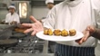 Unrecognizable person wearing chef's uniform holding a clean white plate with five pieces of cooked tandoori chicken on it, with his fingers splayed out, in the background is a busy commercial Indian kitchen