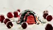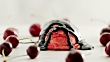Cherry ice cream covered with chocolate sauce with fresh cherries beside