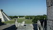 Wide shot, right to left pan of Chac Mool in the foreground and Chichen Itza Pyramid in the background