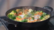 Chicken Alfredo pasta preparation. Cooking pan with ingredients which are marinated chicken filet chops, garlic, double cream, penne, broccoli and grated Italian cheese. Stirring with wooden spoon. Putting lid on top.