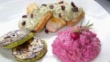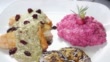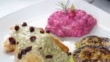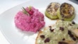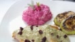 Chicken breasts with red beet risotto and zucchini