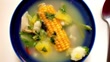 High angle view of delicious chicken soup with vegetables as sweet corn ready to eat at home for lunch. Video made in normal natural light from window in studio.