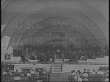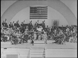 Child prodigy Lorin Maazel shakes hands with Musicians Union President James Petrillo, Petrillo pats Maazel on head / Maazel conducts orchestra at Grant Park Bandshell, American Flag up on stage / Maazel conducts Wagner's Ride of the Valkyries / montage of shots of Maazel conducting / horn section playing / cellists playing / violinists playing / timpani drums being played / Maazel conducting.