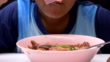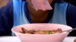 Children eat Yentafo noodles on a white table. - 4K stock video