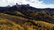 Video featuring aspen forests dressed up in bright yellow autumn colors from a drone perspective; flying over Colorado's San Juan mountains, and approaching iconic Chimney Rock and Courthouse Rock on Owl Creek Pass