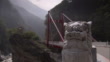 A Chinese guardian lion statue presides over a bridge in forested mountains. - HD stock video