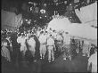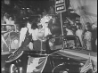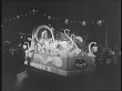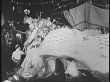Chinese men carry large dragon puppet down city street / car carrying Anna Mae Wong and Ann Miller (below signs identifying them as such) drives down parade route / car carrying Bob Hope drives down parade route / large and elaborately decorated floats drive down parade route carrying Margaret Fong dressed in traditional costume.