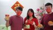 An Asian siblings with matching face mask are feeling cheerful for Chinese New Year celebration at home.
