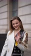 PARIS, FRANCE - MARCH 06: (SLOW-MO) Chloe Grace Moretz wears gold and diamonds earrings from Louis Vuitton, a white shiny leather with gold and black print pattern blazer jacket from Louis Vuitton, black cyclist suit shorts from Louis Vuitton, a black Epi leather Petite Malle handbag clutch from Louis Vuitton, back shiny leather with white details block heels knees boots from Louis Vuitton, outside Louis Vuitton, during Paris Fashion Week - Womenswear Fall Winter 2023 2024, on March 06, 2023 in Paris, France. (Footage by Edward Berthelot/Getty Images)