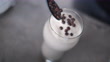 Close-up video shot of chocolate chip falling on top of a protein shake