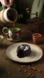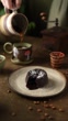 In the front there is a lava cake with chocolate dripping on it, in the background a woman dressed in vintage clothes is pouring coffee.