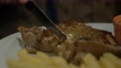 Chopping chicken steak on white plate, body part.