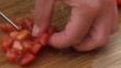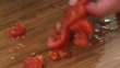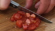 Handheld, close up shot of red tomato being chopped by a paring knife.