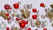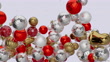 Colorfully wrapped Christmas presents and ornaments on a grey background