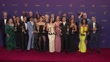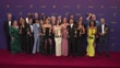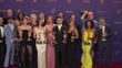 LOS ANGELES, CALIFORNIA - SEPTEMBER 15: (L-R) Christopher McDonald, Ariel Karlin, guest, Carol Leifer, Carl Clemons-Hopkins, Andrew Law, Nate Young, Mark Indelicato, Aisha Muharrar, Rose Abdoo, guest, Jen Statsky, Jean Smart, Lucia Aniello, Michael Schur, Hannah Einbinder, Morgan Sackett, Paul W. Downs, David Miner, Ashley Glazier, Guy Branum, Samantha Riley and Joe Mande, winners of the Outstanding Comedy Series award for "Hacks" pose in the press room during the 76th Primetime Emmy Awards at Peacock Theater on September 15, 2024 in Los Angeles, California. (Footage by Adam Jason Finmann/Getty Images)