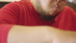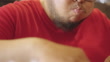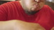 Chubby young guy concentrating on eating double cheeseburger for lunch in a gourmet burger restaurant. - 4K stock video