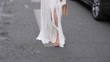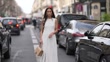 PARIS, FRANCE - MARCH 9: (SLOW-MO) Ciinderella Balthazar wears braided hair with pearl detail, gold earrings, white sleeveless pleaded sheer mesh Akris maxi dress, light brown Akris leather bag, outside Akris, during the Paris Fashion week Women's Fall/Winter 2025-2026 on March 9, 2025 in Paris, France. (Footage by Edward Berthelot/Getty Images)