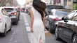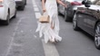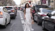 PARIS, FRANCE - MARCH 9: (SLOW-MO) Ciinderella Balthazar wears braided hair with pearl detail, gold earrings, white sleeveless pleaded sheer mesh Akris maxi dress, light brown Akris leather bag, outside Akris, during the Paris Fashion week Women's Fall/Winter 2025-2026 on March 9, 2025 in Paris, France. (Footage by Edward Berthelot/Getty Images)