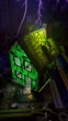 A tiny circuit board home is zapped by a tesla coil discharge.