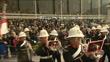 Royal Navy: City of Portsmouth bid farewell to HMS Ark Royal; ENGLAND: Hampshire: Portsmouth:EXTRoyal Marines band marching down the High StreetFormer HMS Ark Royal aircraft carrier sailors marching through streetBanner in crowd reading 'Farewell to the Mighty Ark' as Marines band past PULL OUTFarewell ceremony underway at city centre's town hall